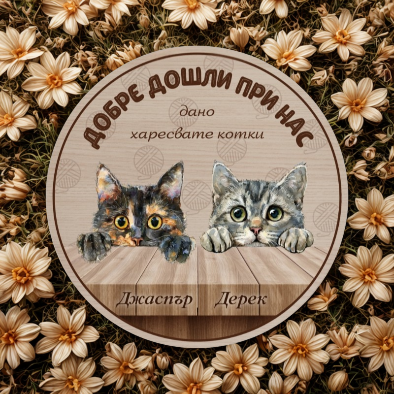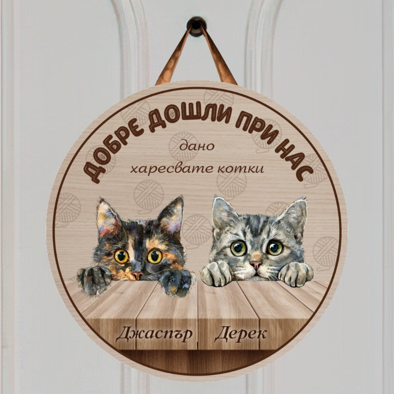 Добре дошли при нас - табела за врата с котки
