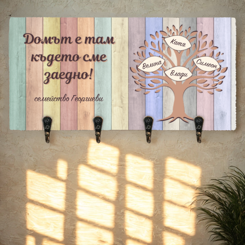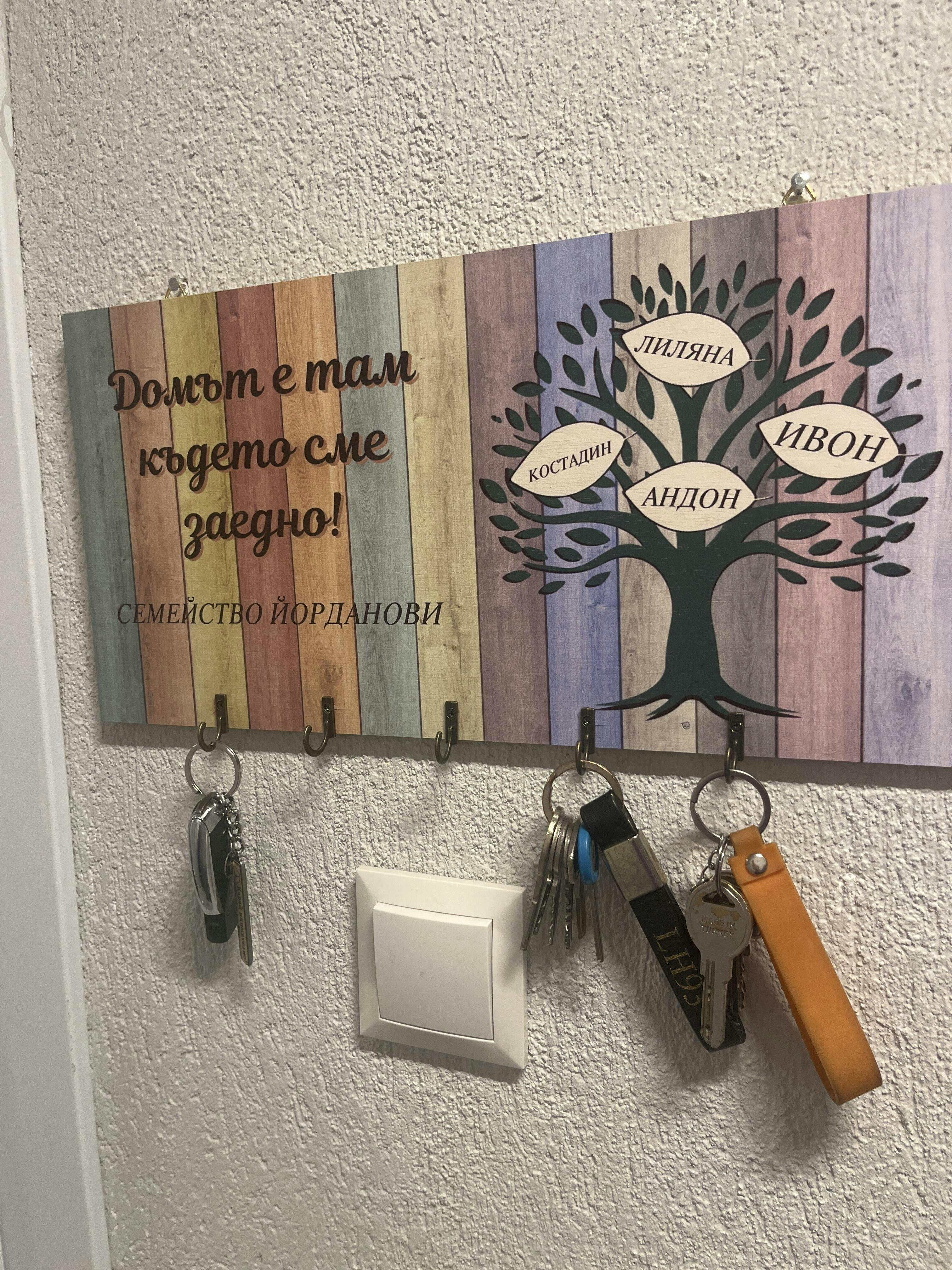Този практичен и стилен аксесоар е изработен от висококачествено дърво и е оборудван с здрави метални кукички, които ще държат вашите ключове на едно място. Можете да персонализирате дизайна с вашите имена и облик, за да придадете индивидуален стил на вашето пространство.