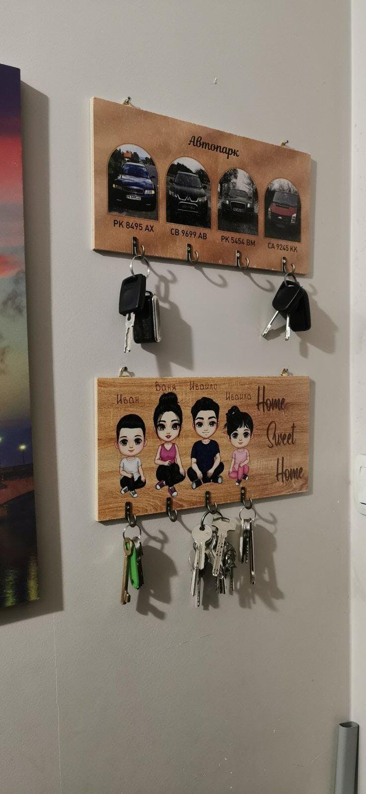 Този практичен и стилен аксесоар е изработен от висококачествено дърво и е оборудван с здрави метални кукички, които ще държат вашите ключове на едно място. Можете да персонализирате дизайна с вашите имена и облик, за да придадете индивидуален стил на вашето пространство.