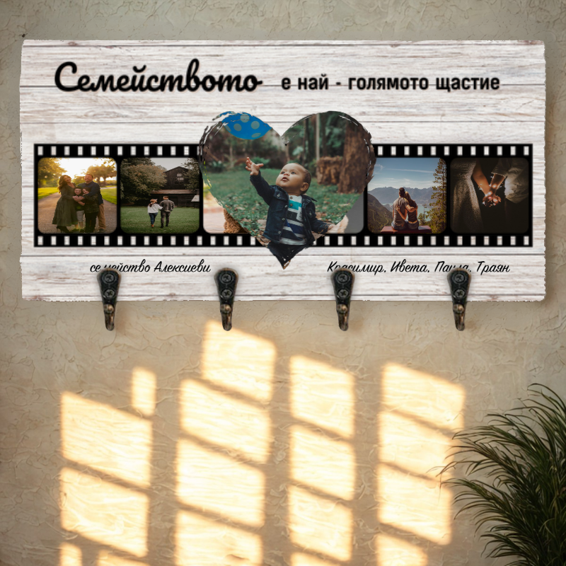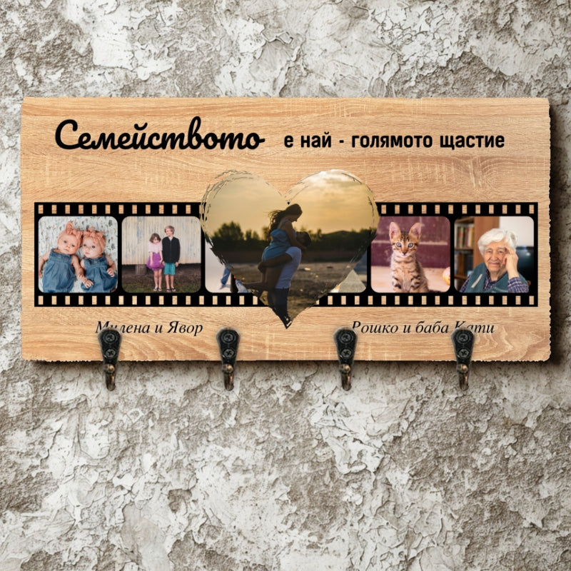 Този практичен и стилен аксесоар е изработен от висококачествено дърво и е оборудван с здрави метални кукички, които ще държат вашите ключове на едно място. Можете да персонализирате дизайна с вашите имена и облик, за да придадете индивидуален стил на вашето пространство.